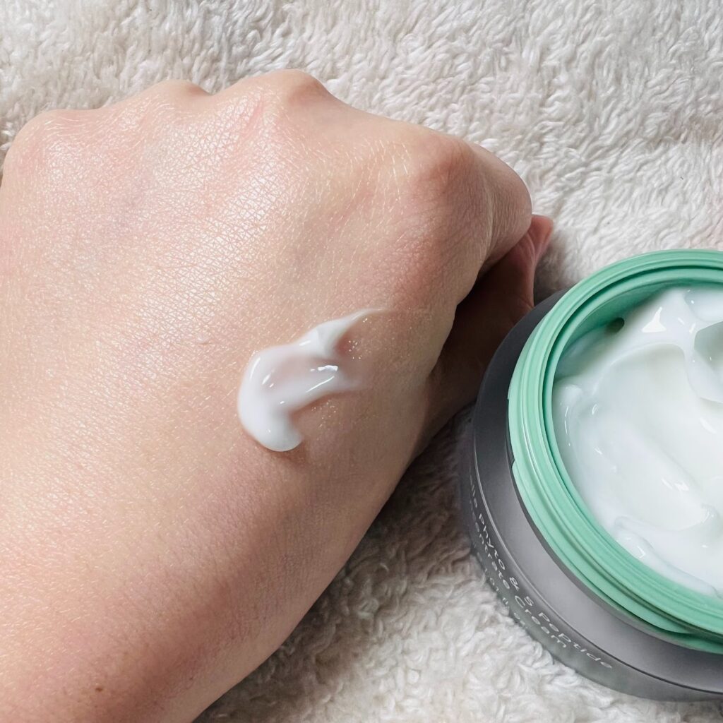 手に吸いつくようなもっちりとしたテクスチャーですが、重たい感じはないので混合肌にも使いやすいクリームでした。